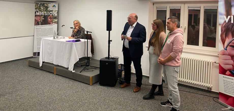 Unser Foto zeigt (von links) Bestseller-Autorin Carla Berling, Kulturamtsleiter Axel Muhn (Gemeinde Höchst i. Odw.), Kati Büschel (Buchhandlung „Zum roten Hering“ Höchst i. Odw.) und Gerhard Henning