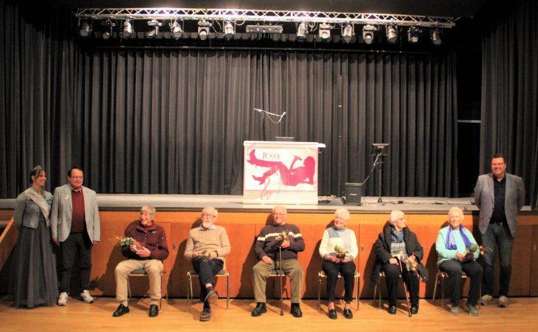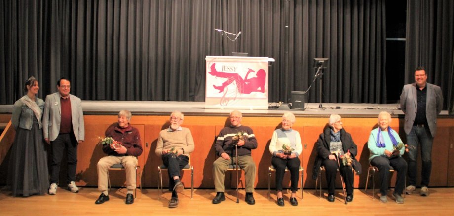 Ehrung der ältesten Teilnehmerinnen und Teilnehmer des Seniorennachmittags der Gemeinde Höchst i. Odw.: V.l.n.r. Apfelblütenkönigin Emma I., Beigeordneter Harald Staier, Wolfgang Franzmathes, Heinz Scheich, Philipp Bäcker, Lieselotte Weick, Toni Scheuermann, Ruth Hörtrich