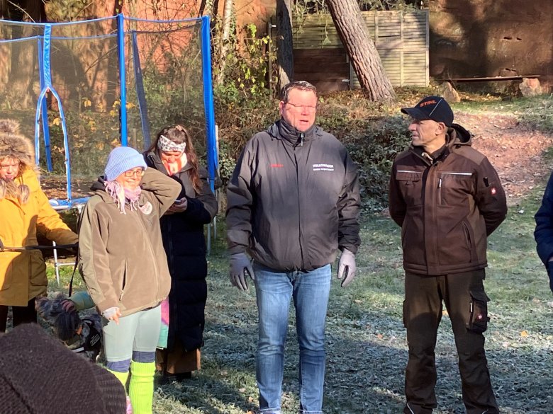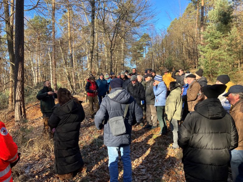 Revierförster Michel Monter erläutert die Regenwasserhaltung im Wald durch die Anlage von sogenannten „Wassertöpfen“, in denen auch zuweilen Mulche und Enten zu finden sind und die damit auch zum Artenschutz beitragen.