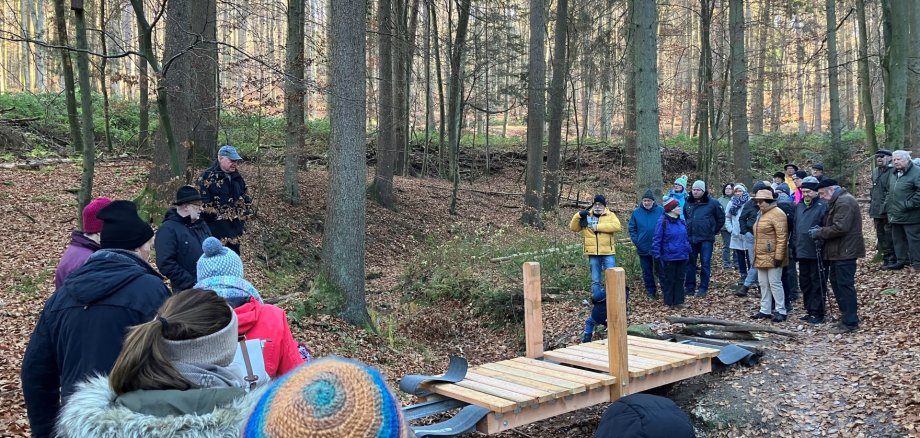 Aufmerksame Zuhörer hatte Klaus Pankow (links oben etwas erhöht stehend) bei der Erläuterung zur Erneuerung einer der insgesamt 14 Brücken in der Obrunnschlucht.