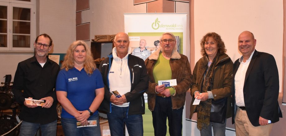 Beigeordneter Ralf Bämpfer-Vetter dankte den Mitgliedern der DLRG-Ortsgruppe Höchst i. Odw. (von links) Stefanie Hallstein (Leiterin Ausbildung und Einsatz), Bruno Knieriem (Trainer), Peter Gürges (Materialwart) und Martina Eisenhauer (Kassenprüferin) gemeinsam mit dem Ersten Kreisbeigeordneten Oliver Grobeis (rechts) für deren ehrenamtliches Engagement bei der Schwimmausbildung, Wasserrettung und Badeaufsicht.