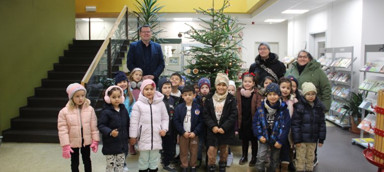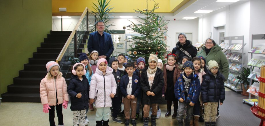 Unser Bild zeigt die Vorschulkinder der Kindertagesstätte „Am See“ mit den Erzieherinnen Manuela Lima-Caldas (Leiterin der Einrichtung) und Melissa Fernandez Gonzalez sowie Bürgermeister Jens Fröhlich vor dem geschmückten Weihnachtsbaum im Höchster Rathaus.