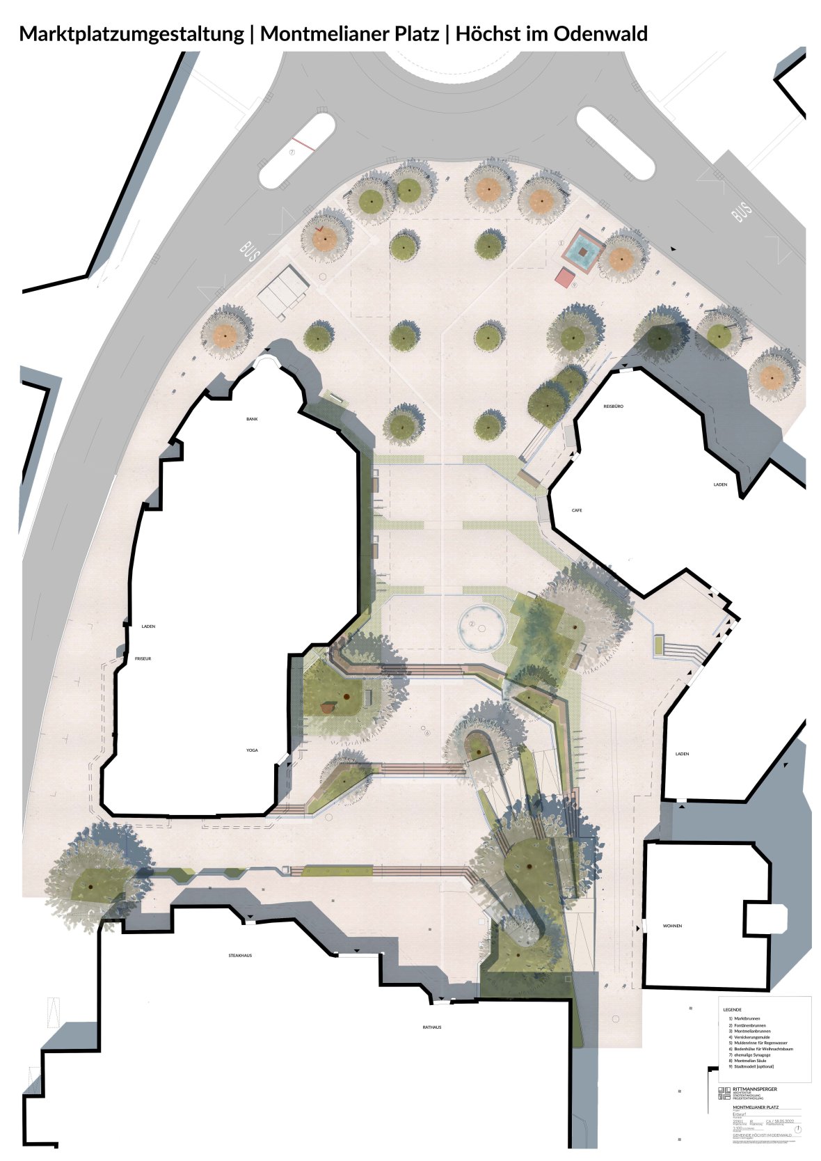 Die bestehenden Bäume werden größtenteils in die Neuanlage integriert und um weitere Baumpflanzungen ergänzt. Im mittleren Platzbereich wird ein bodengleicher Fontänenbrunnen angelegt.