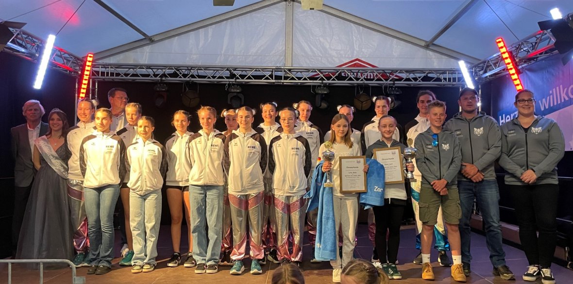 Das Bild zeigt die Teilnehmerinnen und Teilnehmer der letztjährigen Sportlerehrung im Festzelt. Im Vordergrund rechts stehen die Sportlerinnen des Jahres, Zarah Koch und Lotte Muhn. Mit auf dem Bild sind Bürgermeister Jens Fröhlich sowie Klaus-Dieter Neumann, Ehrenvorsitzender des Sportkreises Odenwald und die Apfelblütenkönigin Emma I. .